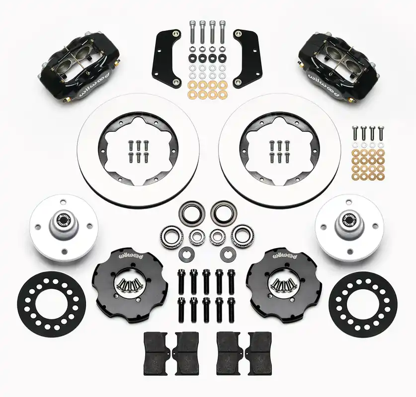 FDL Pro-Series Front Hub Kits offer complete disc brake upgrade solutions for traditional drum spindle applications on American muscle cars, vintage rods, and heavy weight drag cars. This kit designed for 63-66 Mustang & Falcon 6 cylinder spindles. Using the venerable forged billet Dynalite 4 piston caliper, 10.75 indiameter rotor and forged aluminum hub assembly that will overall increase the offset the wheel by +0.92 with the included wheel spacer over the original drum brake. Removal of the spacer will lessen the offset to +0.72 in , but may cause interference between wheel and caliper. Please consult the wheel clearance diagram and instruction sheet before purchasing and installing. This kit does not require spindle modifications for installation, and can provide plenty of clearance inside many popular 14” or 15” wheels. FDL Pro-Series kits can be used with either manual or power boost master cylinders.