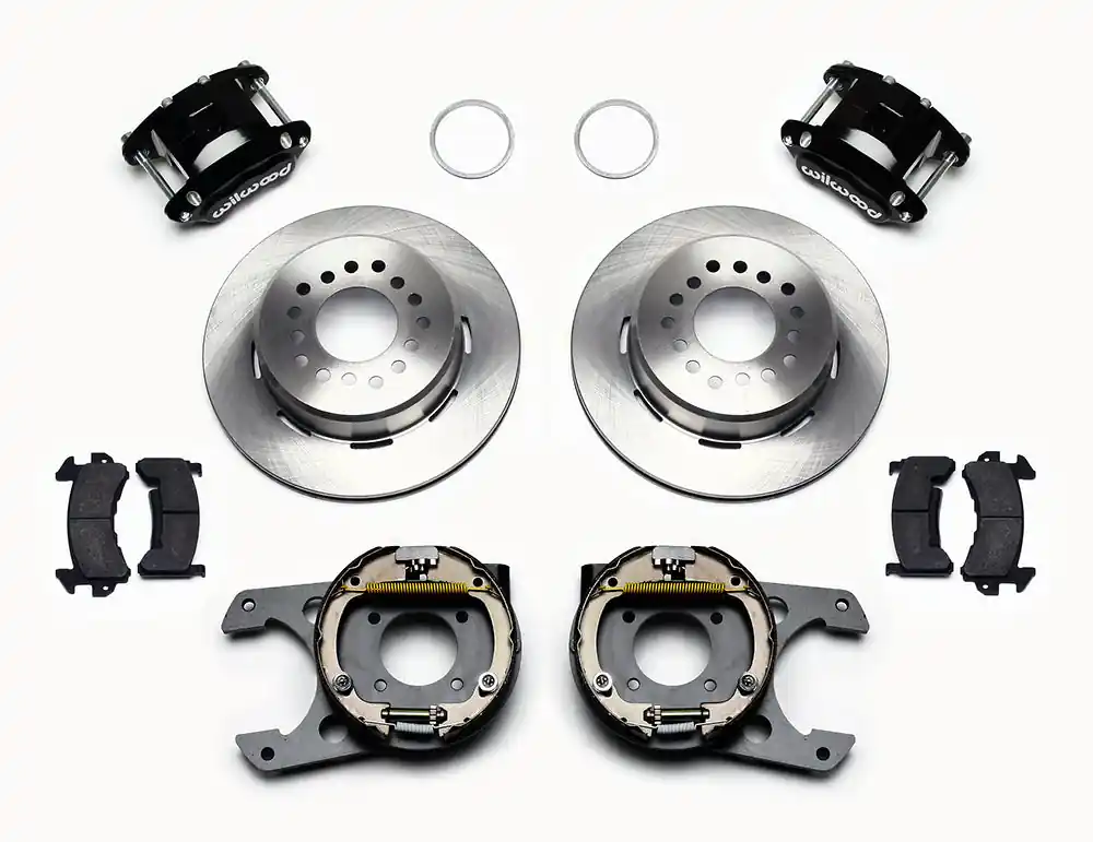 D154 Pro-Series rear disc kits provides a complete solution for popular muscle car rear axles that require a parking brake. Forged D154 dual piston calipers, 12.19” one-piece drum/rotors, and high friction pads provide optimized and balanced braking for all types of custom performance street/strip and show machines. The neatly hidden internal shoe system provides a clean installation with superior static holding power for parking. D154 rear caliper kits offer a complimentary match to vehicles using Wilwood D52 or D154 calipers on OE spindles. Optional caliper finishes and rotor designs enable the builder to personalize the style and optimize brake performance.