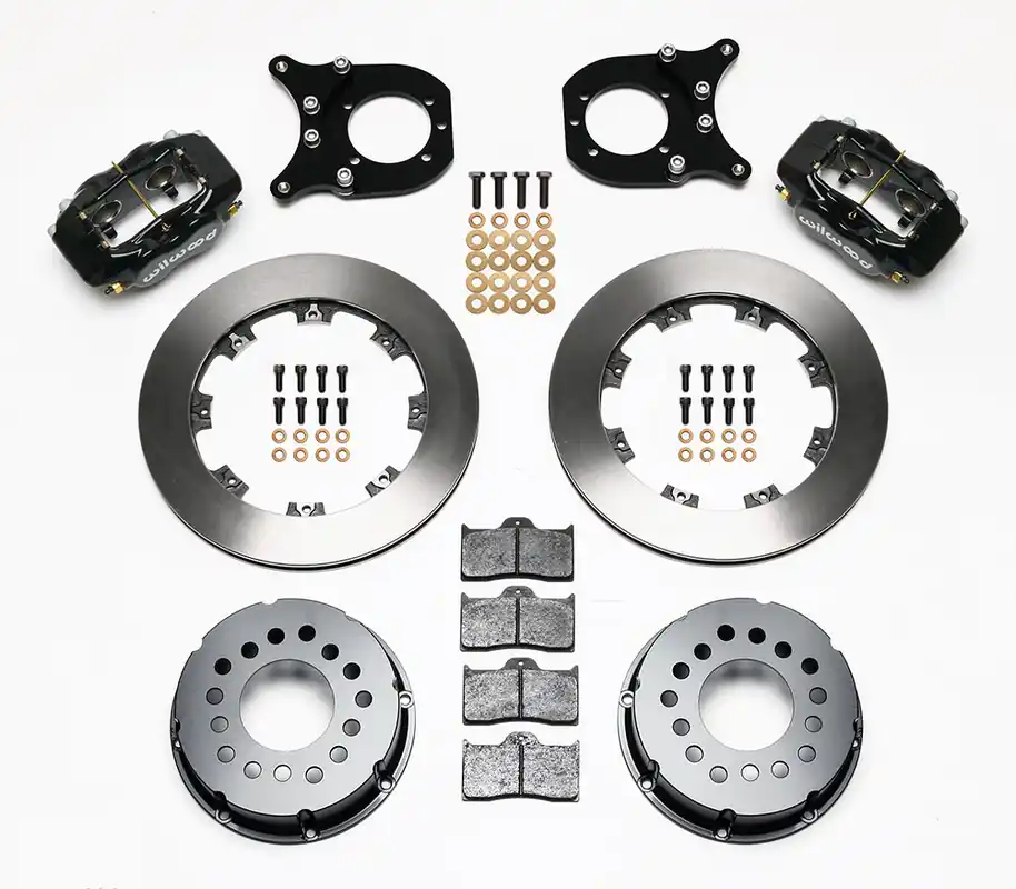 FDL Pro-Series rear disc brake kits provide a complete solution for popular muscle car rear axles on applications where individual wheel parking brake assemblies are not required. Forged billet Dynalite four piston calipers, two-piece hat and rotor assemblies, and high friction pads provide optimized and balanced braking for all types of off-road, competition, and other customized applications. FDL calipers can be optioned with a full range of finishes to reflect personalized style.Rotor choices provide options for high-tech show winning style, or heavy weight durability and cooling capacity for high heat competition.