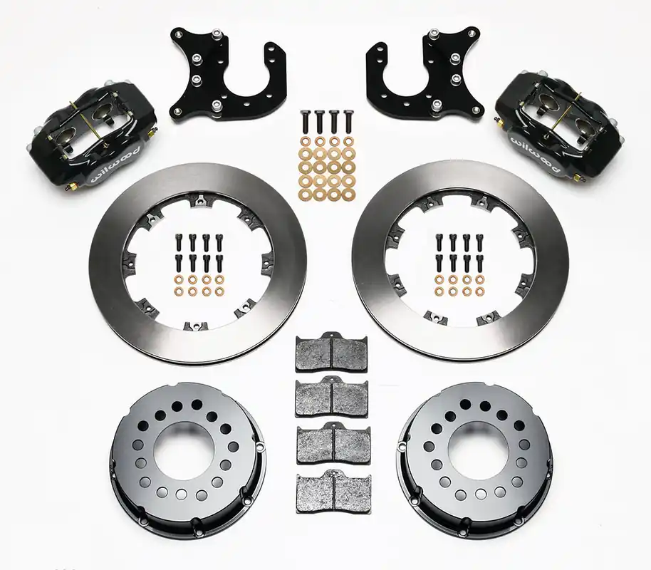 FDL Pro-Series rear disc brake kits provide a complete solution for popular muscle car rear axles on applications where individual wheel parking brake assemblies are not required. Forged billet Dynalite four piston calipers, two-piece hat and rotor assemblies, and high friction pads provide optimized and balanced braking for all types of off-road, competition, and other customized applications. FDL calipers can be optioned with a full range of finishes to reflect personalized style.Rotor choices provide options for high-tech show winning style, or heavy weight durability and cooling capacity for high heat competition.