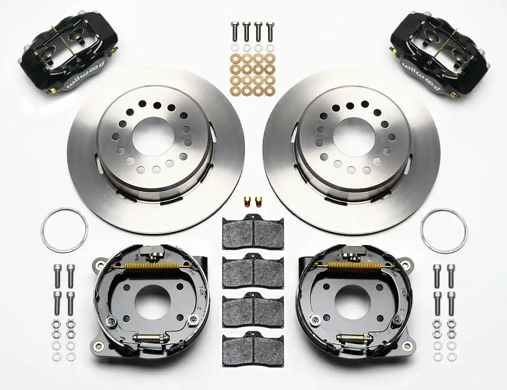 This group of FDL Pro-Series rear disc kits provides a complete solution for popular muscle car rear axles that require a parking brake. Forged billet Dynalite four piston calipers, 12.19” one-piece drum/rotors, and high friction pads provide optimized and balanced braking for all types of custom performance street/strip and show machines. The neatly hidden internal shoe system provides a clean installation with superior static holding power for parking. Optional caliper finishes and rotor designs enable the builder to personalize the style and optimize brake performance for every individual application.