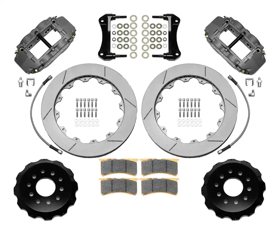 This kit is configured for dedicated road racing on all 1988-1996 Chevrolet Corvette and requires 17” or larger wheels designed with additional inside clearance to accommodate the larger than stock brake package. The six piston FNSL6R/ST radial mount calipers used in this kit feature a forged aluminum body with a Type III Mil-Spec hard anodized, medium gray color finish. Hard anodizing provides superior wear resistance in the piston bores, and high resistance to abrasion and corrosion throughout. Thermlock® pistons are used to reduce heat transfer from the pads to increase fade resistance, and to extend service life by decreasing temperatures in the caliper body, fluid, and seals. Internal damper springs and controlled retraction, high-temperature piston seals assure consistent pedal height from start to finish. Spec37 alloy, GT competition series 12.88” diameter directional vane rotors are fixed mounted to the OE hubs with weight saving forged aluminum hats. Unsprung and rotating weight are minimized while providing high cooling efficiency and rugged durability with thermal stability in sustained high heat competition. Mounting brackets, including all premium grade fasteners, secure the calipers in the stock location without modifications.This race winning system is completed with high temperature, high friction, endurance compound race pads selected specifically by application. Stainless steel braided flexlines are included.