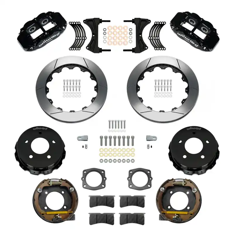 Forged Narrow Superlite 4R rear disc kits provide the ultimate Big Brake solution for popular muscle car rear axles that require a parking brake. FNSL4R four piston calipers, 13” or 14” two-piece rotors, and high performance BP-10 compound pads provide optimized and balanced braking to compliment front big brake upgrades on all types of custom, show and high performance street machines. The neatly hidden internal shoe system provides a clean installation with superior static holding power for parking. Optional caliper finishes and rotor designs allow builders to personalize the style and performance for every application.