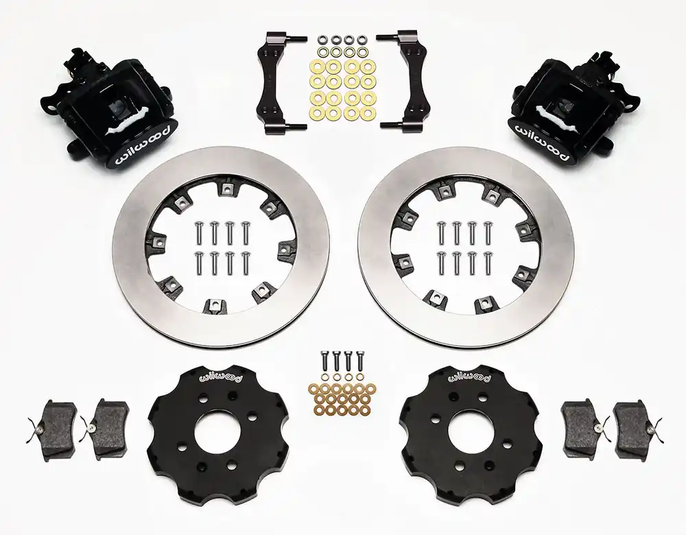 Combination hydro-mechanical Parking Brake calipers use hydraulic pressure from the master cylinder for stopping power, and an internal mechanical lock within the caliper for a parking brake. CPB kits are built primarily for front wheel drive vehicles, and select rear wheel drive axles that are not well suited for internal shoe style parking brakes. The calipers are coupled with oversized two-piece rotor assemblies with aluminum hats and high friction BP-10 compound pads. CPB kits provide the correct balanced brake performance and matching style to compliment front big brake upgrade kits.