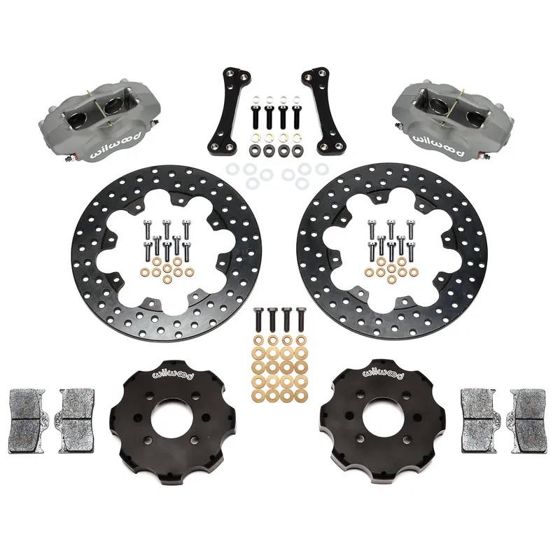 FDL Front Drag Brake Kits with Hats are drag racing’s most popular front brake kits. FDL kits are available for the popular Import car spindles or front struts used on four-wheel disc cars weighing up to 2,800 pounds, or rear drum brake equipped cars weighing up to 2,400 pounds. Forged billet FDL four piston calipers mount directly to the spindle with a bolt-on bracket. Forged Hats with direct mount steel rotors combine to provide an average weight savings of over 30 pounds compared to stock drum or disc brakes. Kits include attachment hardware, brake pads, and instructions.