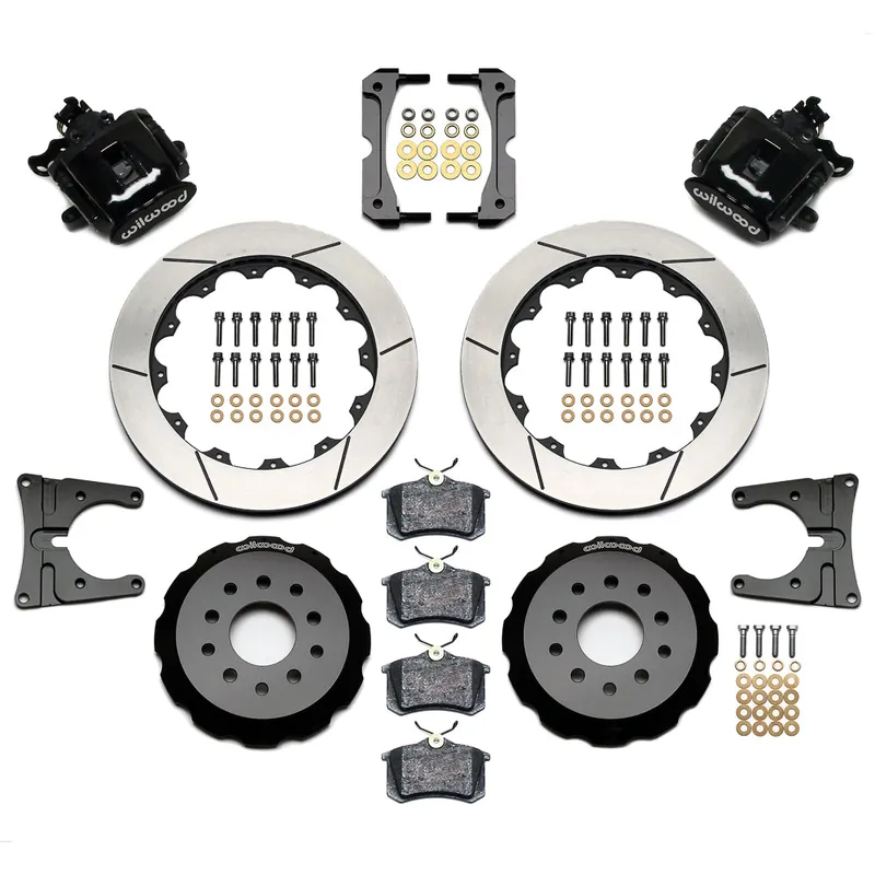 Combination hydro-mechanical Parking Brake calipers use hydraulic pressure from the master cylinder for stopping power, and an internal mechanical lock within the caliper for a parking brake. CPB kits are built primarily for front wheel drive vehicles, and select rear wheel drive axles that are not well suited for internal shoe style parking brakes. The calipers are coupled with oversized two-piece rotor assemblies with aluminum hats and high friction BP-10 compound pads. CPB kits provide the correct balanced brake performance and matching style to compliment front big brake upgrade kits.