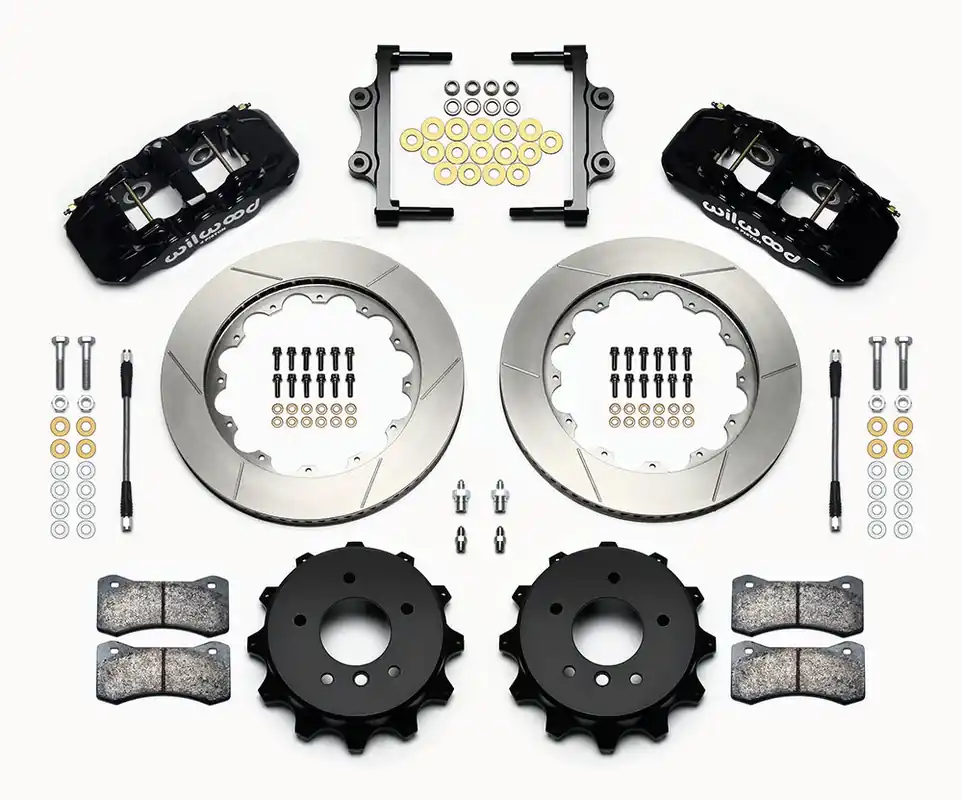 AERO4 Big Brake Rear Axle Kits replace the factory disc brakes and use the OE parking brake assembly as a compliment to front big brake upgrades on late model high performance vehicles. High capacity braking from the W4AR calipers, BP-10 compound pads, and oversized 14.00 inrotors are matched to the OE master cylinder output, ABS function, and individual vehicle bias requirements. Enhanced brake performance, increased durability, and high-tech style compliment big wheel, tire, and suspension upgrades on customized vehicles and all others with increased brake requirements.