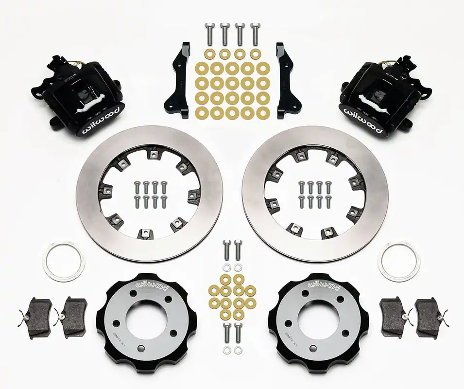 Combination hydro-mechanical Parking Brake calipers use hydraulic pressure from the master cylinder for stopping power, and an internal mechanical lock within the caliper for a parking brake. CPB kits are built primarily for front wheel drive vehicles, and select rear wheel drive axles that are not well suited for internal shoe style parking brakes. The calipers are coupled with oversized two-piece rotor assemblies with aluminum hats and high friction BP-10 compound pads. CPB kits provide the correct balanced brake performance and matching style to compliment front big brake upgrade kits.