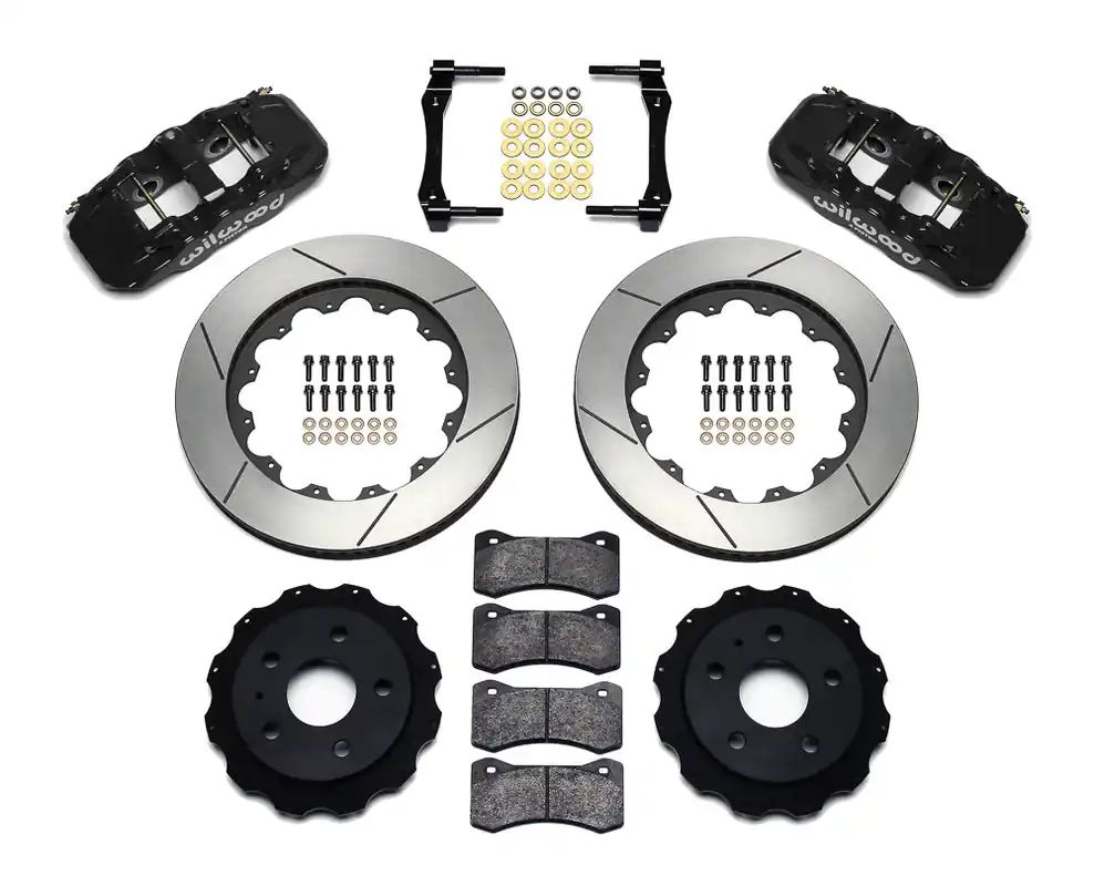 AERO4 Big Brake Rear Axle Kits replace the factory disc brakes and use the OE parking brake assembly as a compliment to front big brake upgrades on late model high performance vehicles. High capacity braking from the W4AR calipers, BP-10 compound pads, and oversized 14.00 inrotors are matched to the OE master cylinder output, ABS function, and individual vehicle bias requirements. Enhanced brake performance, increased durability, and high-tech style compliment big wheel, tire, and suspension upgrades on customized vehicles and all others with increased brake requirements.