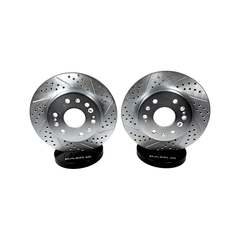 Baer Claw performance rotors are a great way to improve your vehicles braking performance and overall appearance. The kit includes a pair of direct replacement rotors with a cross-drilled and slotted friction surface that allows an escape route for the gasses and dust that form between the pad and rotor during braking providing a more consistent pedal feel and reduced brake fade. Each pair of rotors are zinc-plated providing a brilliant finish behind open center wheels.