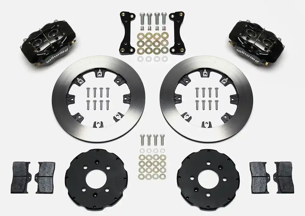 Forged Dynalite ProSeries kits provide high performance, big brake stopping power by combining modern brake technology with high-tech styling to update the brakes on your front-wheel-drive sport compact vehicle. The OE calipers and rotors are replaced with forged aluminum, four-piston calipers mounted over larger diameter, certified alloy 30-vane vented iron rotors. The new two-piece rotor assemblies provide weight-saving forged aluminum mounting hats. The calipers feature an increase in effective piston volume to deliver higher clamping power with less pedal effort than stock. The thicker, vented rotor design adds cooling efficiency and durability to extend service life. BP-series SmartPads add high-response with increased resistance to fade and longer wear over typical OE replacement pads. Options for caliper colors and rotor styles are available to personalize the look on any car. For on-track driving enthusiasts, additional track-only fortifications are available on a custom order basis by contacting the technical staff at the factory.