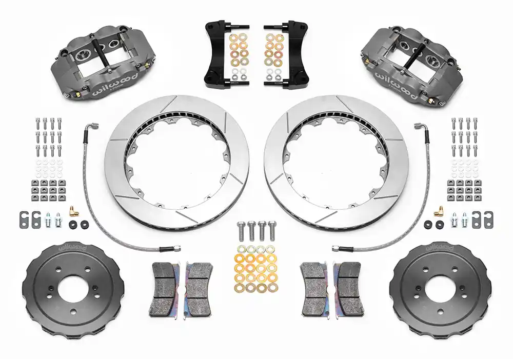This kit is configured for unrestricted category road racing on all models of the 2000-2009 Honda S2000 using 17” or larger diameter wheels. the six piston FSL6R/ST calipers used in this kit feature a forged aluminum body with a Type III Mil-Spec hard anodized, medium gray color finish. Hard anodizing provides superior wear resistance in the piston bores, and high resistance to abrasion and corrosion throughout. Thermlock® pistons are used to reduce heat transfer from the pads to increase fade resistance, and to extend service life by decreasing temperatures in the caliper body, fluid, and seals. Internal damper springs and controlled retraction, high-temperature piston seals assure consistent pedal height from start to finish. Caliper piston volumes are matched for full compatibility with the OE power brake booster and master cylinder, and are easily configured with manual brake conversions and balance bar pedals using appropriately sized master cylinders. Spec37 alloy GT competition series 12.88” diameter directional vane rotors are dynamically mounted to the OE hubs with weight saving forged aluminum hats. Unsprung and rotating weight are minimized while providing high cooling efficiency and rugged durability with thermal stability in sustained high heat competition. Mounting brackets, including all premium grade fasteners, secure the calipers to the spindles in the stock location, without the need for modifications.This championship proven system is completed with high temperature, high friction, endurance race compound pads selected specifically by application. Stainless steel braided flexlines are included in each kit to complete the installation.