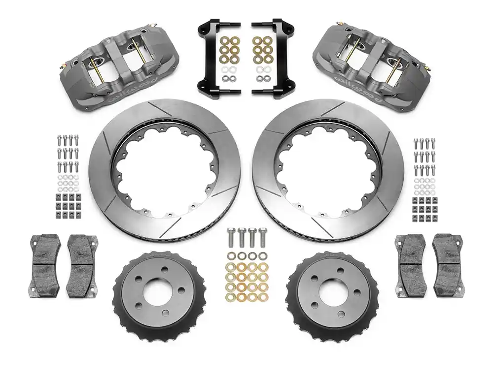 This kit is configured for dedicated road racing on all base, Eco-Boost and standard production GT model 2015-2018 Mustangs, when 14.00” / 355mm rotors are required by rules, or preferred for weight savings. The AERO6R/ST six piston calipers used in this kit feature a forged aluminum body with a Type III Mil-Spec, medium gray color hard anodized finish. Hard anodizing provides superior wear resistance in the piston bores, and high resistance to abrasion and corrosion throughout. This latest model of the AERO6R/ST calipers features a wider than standard body that accepts 20mm thick pads to add volume for longer service life. Thermlock® pistons are used to reduce heat transfer from the pads to increase fade resistance, and to extend service life by decreasing temperatures in the caliper body, fluid, and seals. Internal damper springs and controlled retraction, high-temperature piston seals assure consistent pedal height from start to finish. Caliper piston volumes are matched for full compatibility with the OE master cylinder output and ABS controls. The calipers are also fully compatible with manual brake conversions to balance bar pedals using appropriately sized master cylinders. Spec37 alloy GT series 14.00” diameter directional vane rotors are dynamically mounted to the OE hubs with weight saving forged aluminum hats. As is with the calipers, the hats are hard anodized for superior wear resistance and extended service life at the load bearing surfaces. Mounting brackets, including all premium grade fasteners, secure the calipers to the spindles in the stock location with no modifications required. This championship proven system is completed with high temperature, high friction, race compound pads selected specifically by application. Stainless steel braided flexlines are required for installation and must be purchased separately based on the model year.