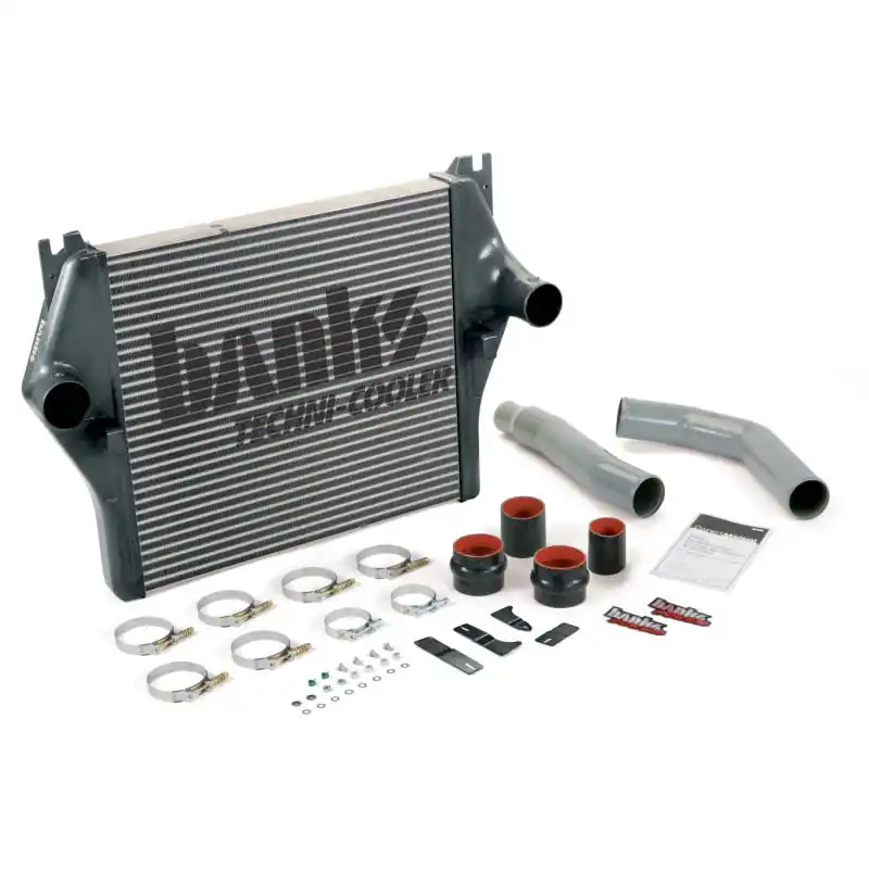 - Superior to stock, everything about Banks Techni-Cooler Intercooler system is bigger. It includes mandrel-bent high-flow boost tubes – large, high-efficiency all-aluminum end tanks – a wide-open inlet and outlet – a thicker core area with an improvement in volume. Techni-Cooler dramatically increases the cooling capacity by balancing the richer fuel mixture with greater airflow and cooler, denser air. Denser air has more oxygen, which improves combustion as well as engine efficiency. Result: higher continuous power and more power at any exhaust gas temp (EGT), better fuel economy, and lower EGTs. Thats a truckload of benefits! Banks Techni-Cooler delivers the maximum reduction in boost air temperature with a minimal loss of boost pressure. It doesn’t get any cooler than Techni-Cooler! Mounting hardware included.