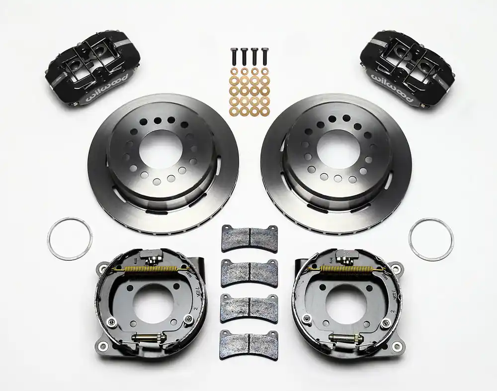 Forged Dynapro Low-Profile Pro-Series rear disc brake kits provide a complete solution for popular muscle car rear axles on applications that require a parking brake assembly and extra clearance for 14.00” to 15.00” rim applications. Forged billet Dynapro Low-Profile four-piston calipers 11.00” one-piece hat and rotor assemblies, and high friction pads provide optimized and balanced braking for all types of custom performance street/strip and show machines. The neatly hidden internal shoe system provides a clean installation with superior static holding power for parking. Optional caliper finishes and rotor designs enable the builder to personalize the style and optimize brake performance for every individual application.