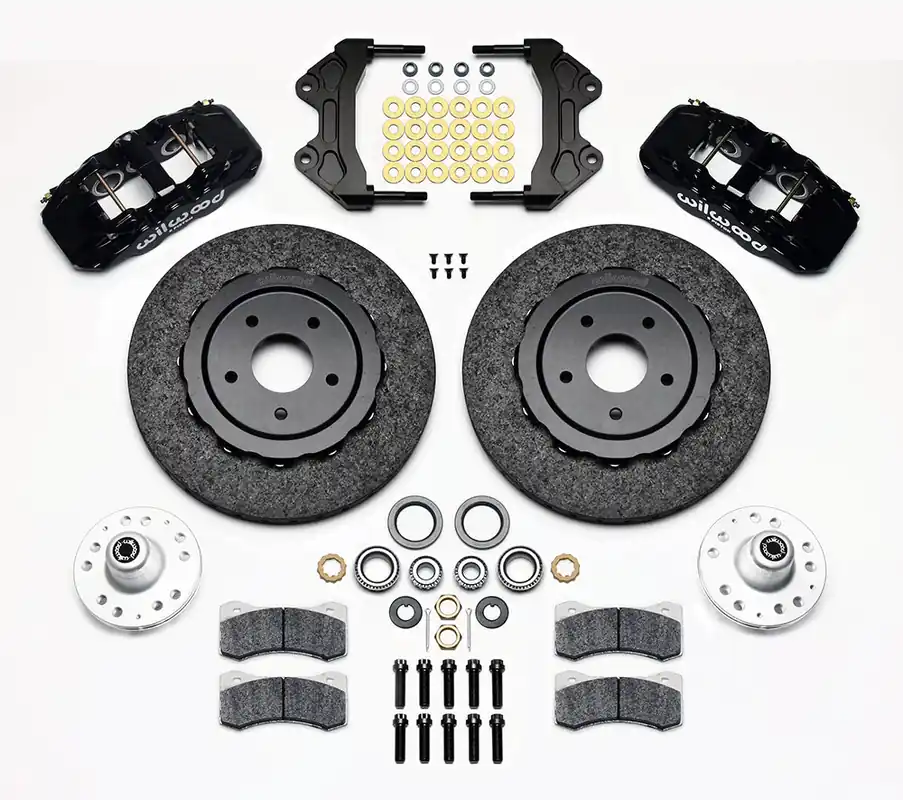 AERO6 WCCB Carbon-Ceramic Rotor Front Brake Kits offer an extreme performance upgrade featuring WCCB Carbon-Ceramic Dynamic Mount Rotors with Wilwood’s exclusive Bobbin Mounting System.AERO6 WCCB kits are engineered to maximize braking capacity inside custom wheels. These brake kits offer a simple bolt-on installation with minor modifications required to the front spindle only and are fully compatible with ABS and OE master cylinder output. AERO6 calipers are a competition proven and offer fully detail machined forged caliper body demonstrates superior strength and resistance to deflection and separation under high load.Black or Red powder coat calipers are available as options. 14.00” WCCB rotors are made from a proprietary blend ceramic matrix composite material commonly known as Carbon-Ceramic and dynamically using Wilwood’s proprietary integrated anti-rattle Bobbin Mounting System. WCCB rotors offer higher thermal conductivity and heat capacity in excess of conventional iron or titanium rotors of similar or even greater weight and have been developed to withstand extreme temperatures with the highest possible degree of resistance against distortion, warping, cracking and wear.
