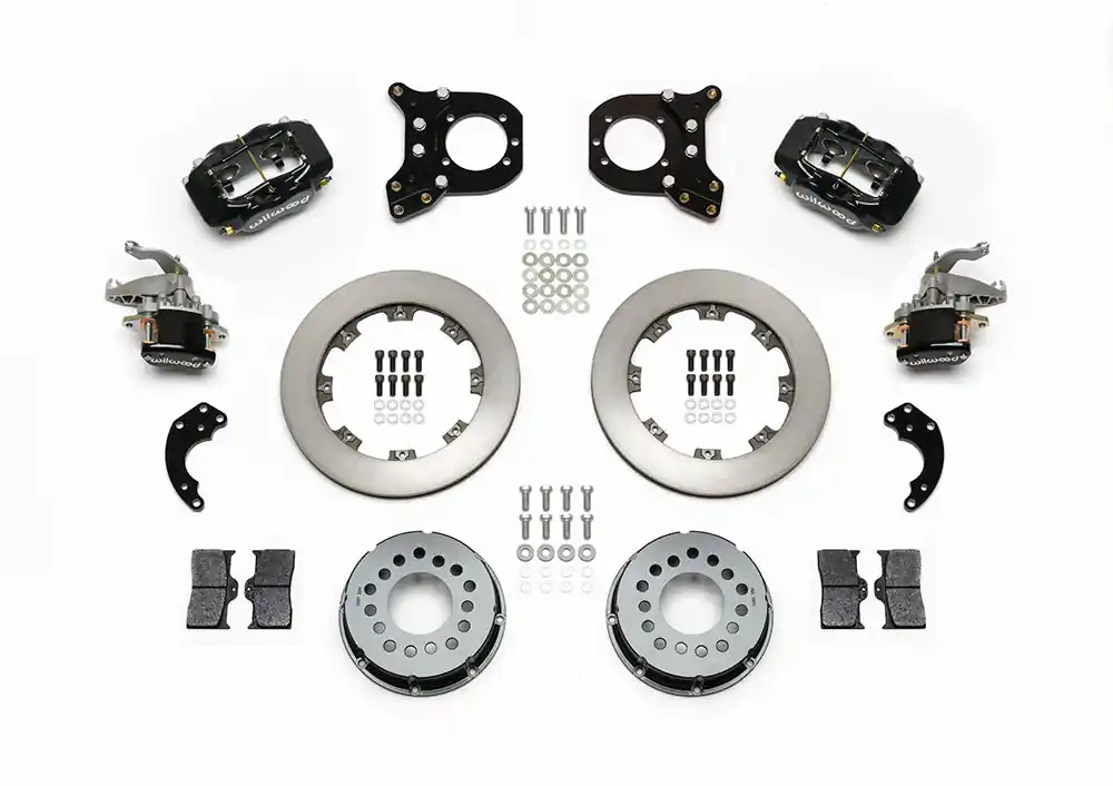 FDL Pro-Series MC4 Parking rear disc brake kits with parking brake provide a complete solution for popular muscle car rear axles on applications where internal drum parking brake assemblies interfere with c-clip eliminator assemblies. Forged Billet Dynalite four piston calipers, MC4 Parking Brake calipers, two-piece hat and rotor assemblies, and high friction pads provide optimized and balanced braking for all types of off-road, competition, and other customized applications. FDL calipers can be optioned with a full range of finishes to reflect personalized style.Rotor choices provide options for high-tech show winning style, or heavy weight durability and cooling capacity for high heat competition.