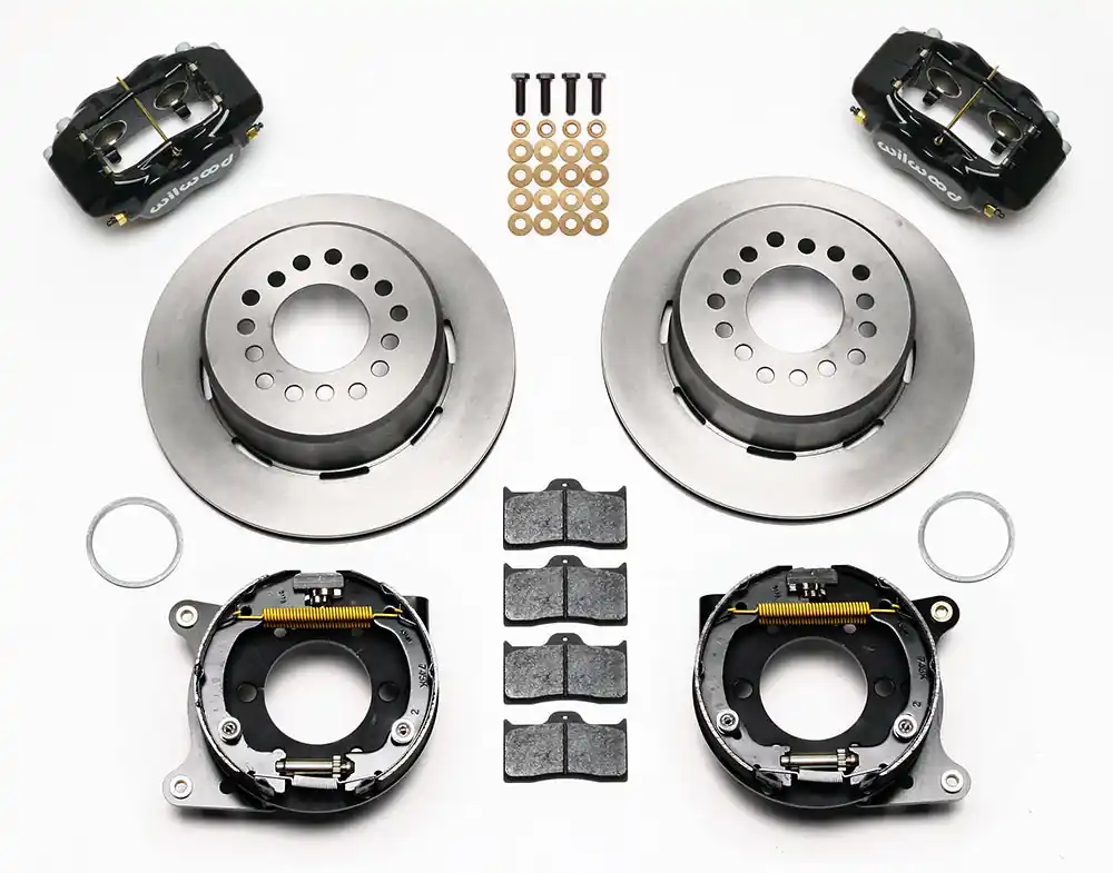 This group of FDL Pro-Series rear disc kits provides a complete solution for popular muscle car rear axles that require a parking brake. Forged billet Dynalite four piston calipers, 12.19” one-piece drum/rotors, and high friction pads provide optimized and balanced braking for all types of custom performance street/strip and show machines. The neatly hidden internal shoe system provides a clean installation with superior static holding power for parking. Optional caliper finishes and rotor designs enable the builder to personalize the style and optimize brake performance for every individual application.