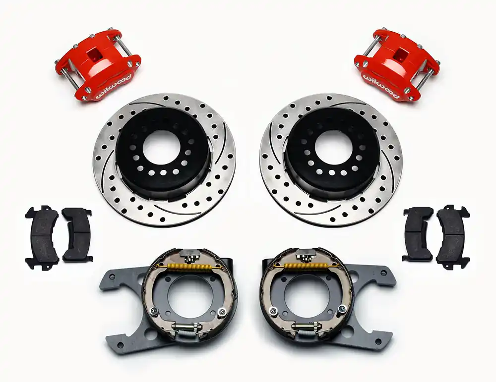 D154 Pro-Series rear disc kits provides a complete solution for popular muscle car rear axles that require a parking brake. Forged D154 dual piston calipers, 12.19” one-piece drum/rotors, and high friction pads provide optimized and balanced braking for all types of custom performance street/strip and show machines. The neatly hidden internal shoe system provides a clean installation with superior static holding power for parking. D154 rear caliper kits offer a complimentary match to vehicles using Wilwood D52 or D154 calipers on OE spindles. Optional caliper finishes and rotor designs enable the builder to personalize the style and optimize brake performance.